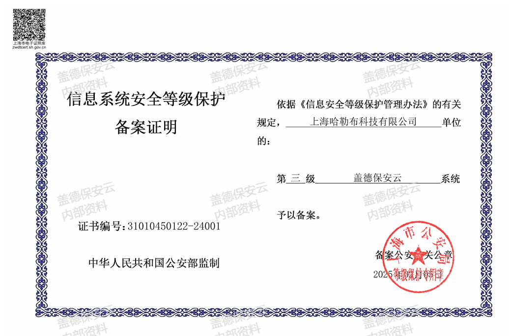 盖德保安云具备官方颁发的最高等级信息安全等级证书。